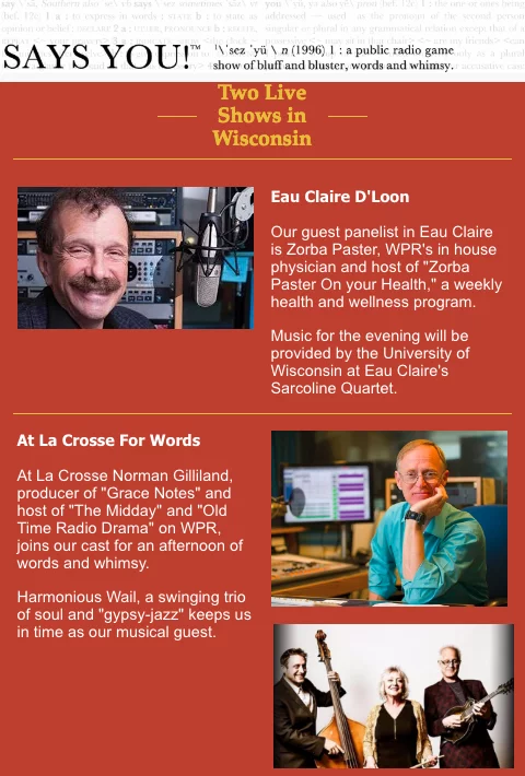 Thanks for the LaCrosse show! I was doubly delighted to see a live show last weekend. First because I saw faces to match voices, second because the interaction and humor was just great. Anybody who listens needs to see a live show. Bravo!