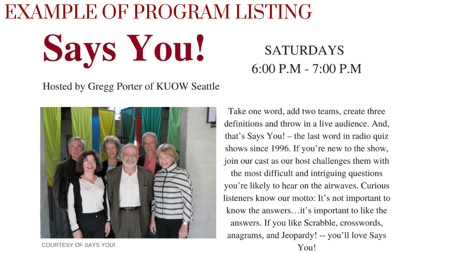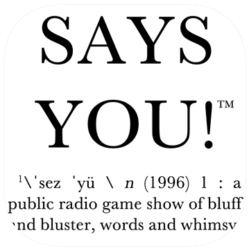 Take one word, add two teams, create three definitions and throw in a live audience. That’s Says You! – the last word in radio quiz shows since 1996. If you’re new to the show, join our cast as our host challenges them with the most difficult and intriguing questions you’re likely to hear on the airwaves. Curious listeners know our motto: It’s not important to know the answers…it’s important to like the answers. If you like Scrabble, crosswords, anagrams, and Jeopardy! — you’ll love Says You!